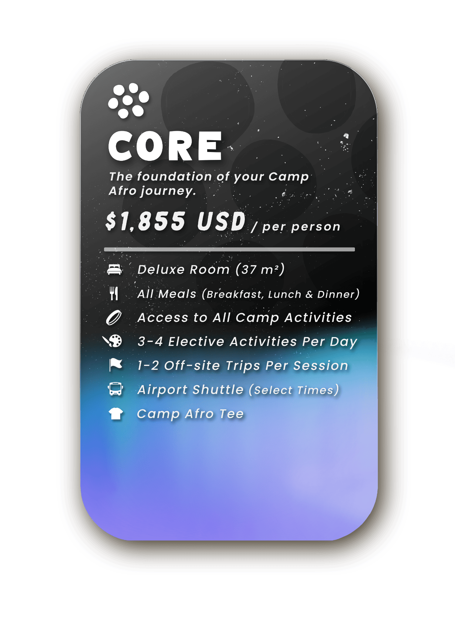 Three unique tiers, each includes accommodation, meals, camp activities, and transfers.